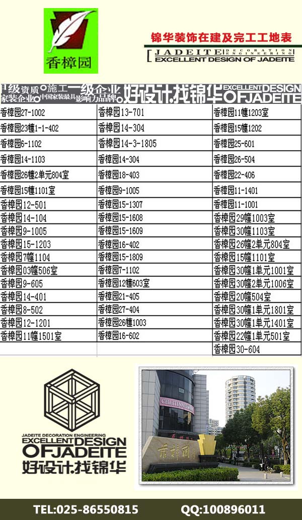 為了更好的讓香樟園的業(yè)主了解錦華裝飾的整個(gè)工藝流程,錦華裝飾仙林片區(qū)分公司整理了所有香樟園的完工及在建工地,歡迎大家來(lái)參觀。