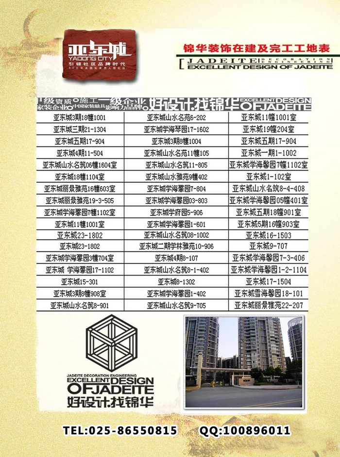 為了更好的讓亞東城的業(yè)主了解錦華裝飾的整個(gè)工藝流程,錦華裝飾仙林片區(qū)分公司整理了所有亞東城的完工及在建工地,歡迎大家來參觀。