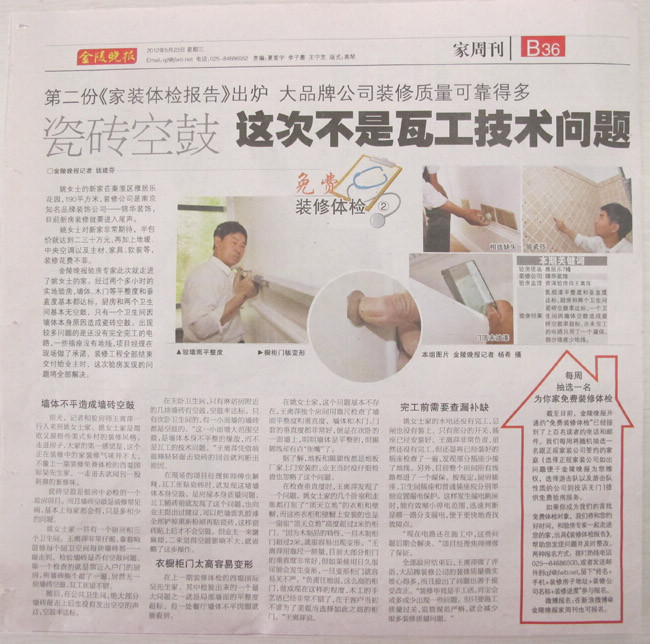 近日,南京知名媒體“金陵晚報”開通了“裝修體檢直通車”服務,邀請廣大正在裝修中的業(yè)主報名,金陵晚報將和驗房專家一起走進業(yè)主家,驗房后出具《家裝體檢報告》,幫助業(yè)主發(fā)現(xiàn)問題并解決問題。