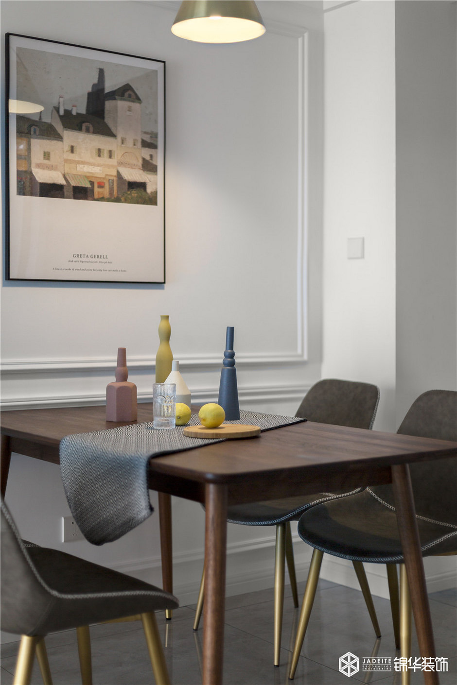 以pu線條代替造價甚高的護墻板,將其直接貼于墻面,增加了空間的層次感,其余的地方則是用不同色彩的墻紙體現(xiàn)空間的活潑性,呈現(xiàn)出空間本身的質(zhì)感與美感,白色和灰色的組合又使得整個空間安靜又舒適。