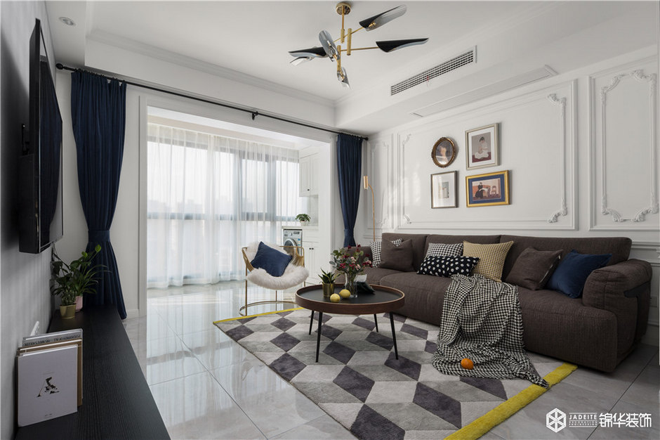將陽臺空間納入室內(nèi),但因為原陽臺的梁無法拆除,如果將其全部遮蓋,客廳的整體高度會降低,設(shè)計師機智地做了一個美式經(jīng)典的格子頂,美觀實用,然后加已線條做出層次使客廳空間看起來高挑。
