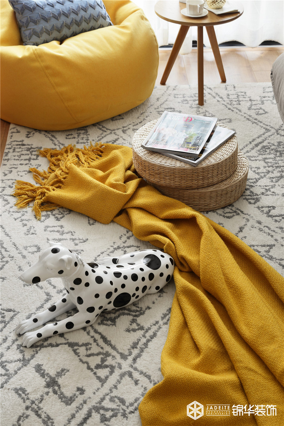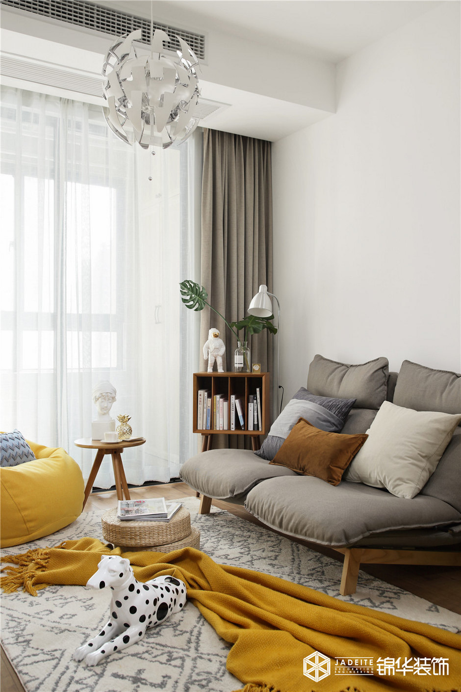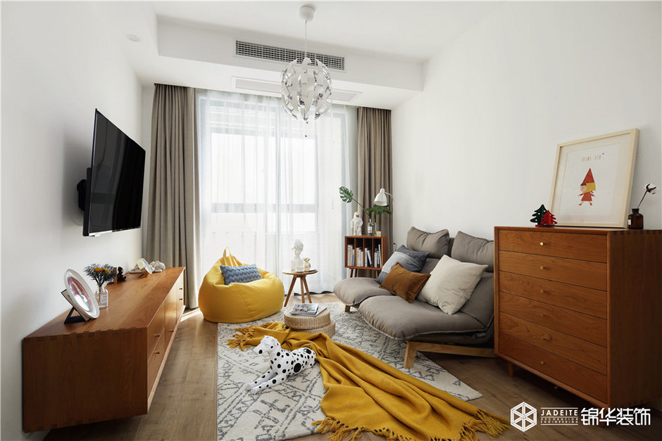 ▲色調(diào)以黃色、灰色、木色為主,溫暖又活潑。布藝、亞麻、木質(zhì)等天然材料的運用,又為空間平添了一種慵懶的繾綣!