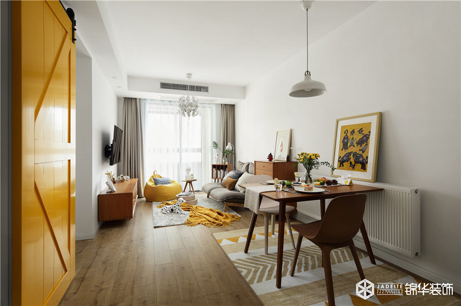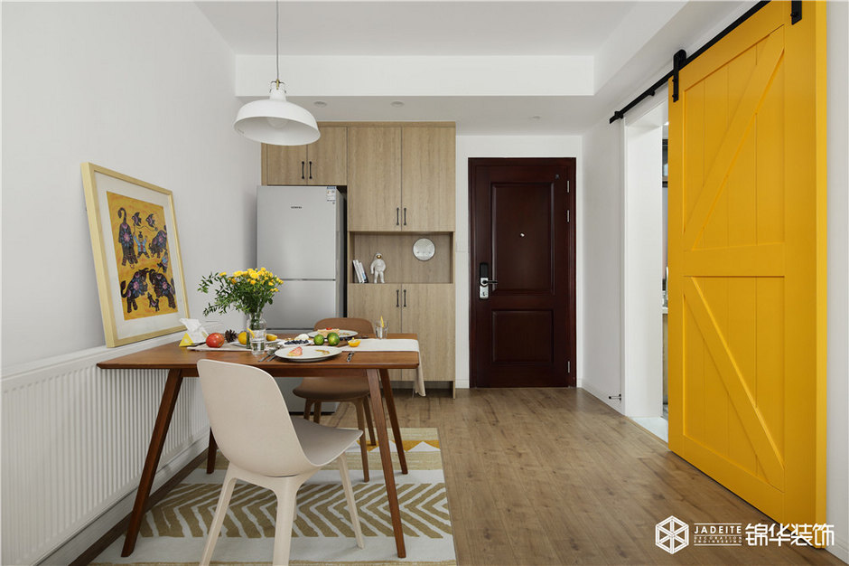 ▲明黃色谷倉門,是空間的視覺亮點之一,它作為廚房和客餐廳的分界線,既有效地節(jié)省了空間占比,又十分具有趣味性!