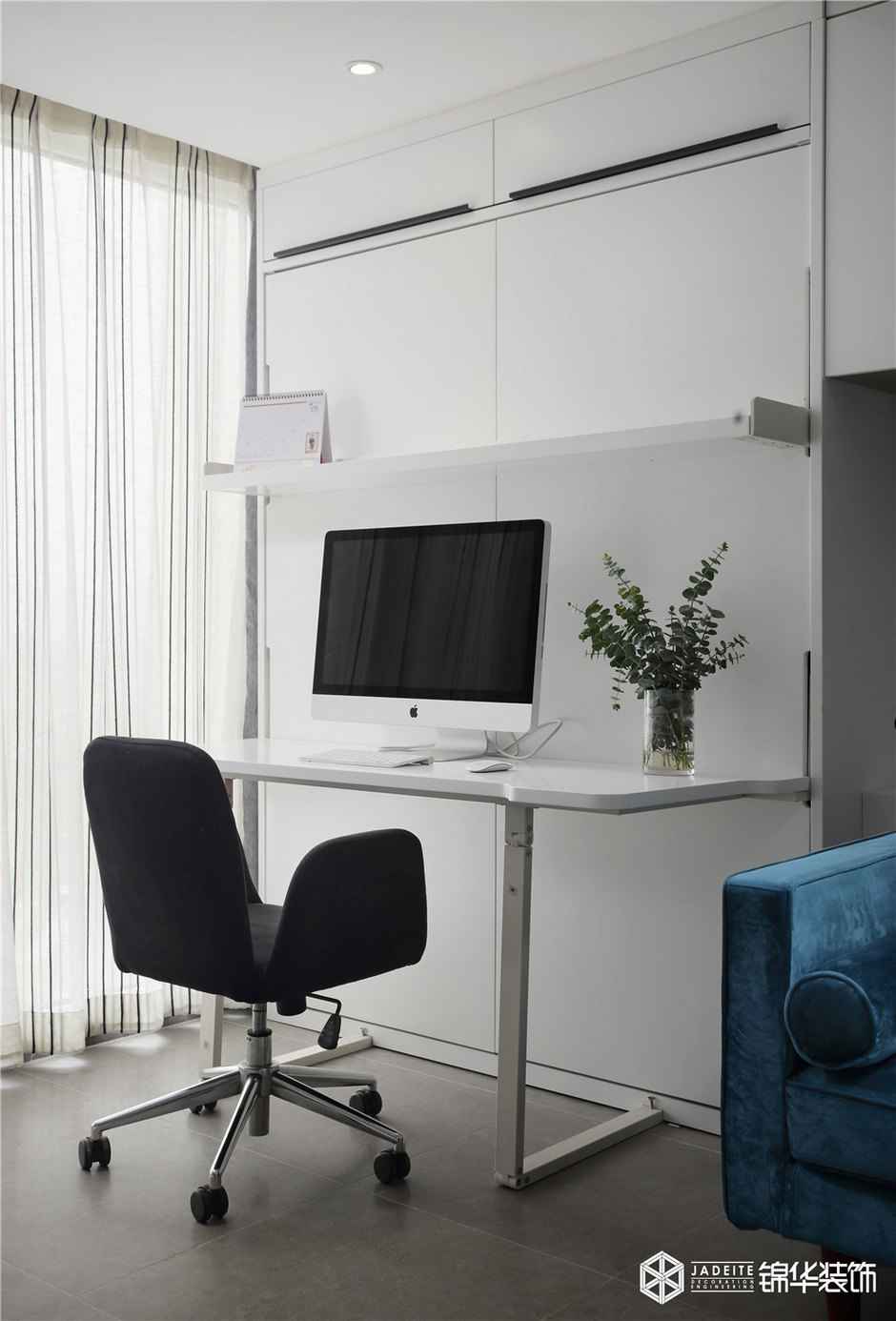 ▲陽臺制作了擱架書桌,業(yè)主偶爾回家時,在臥室也能滿足看書或辦公的需要!