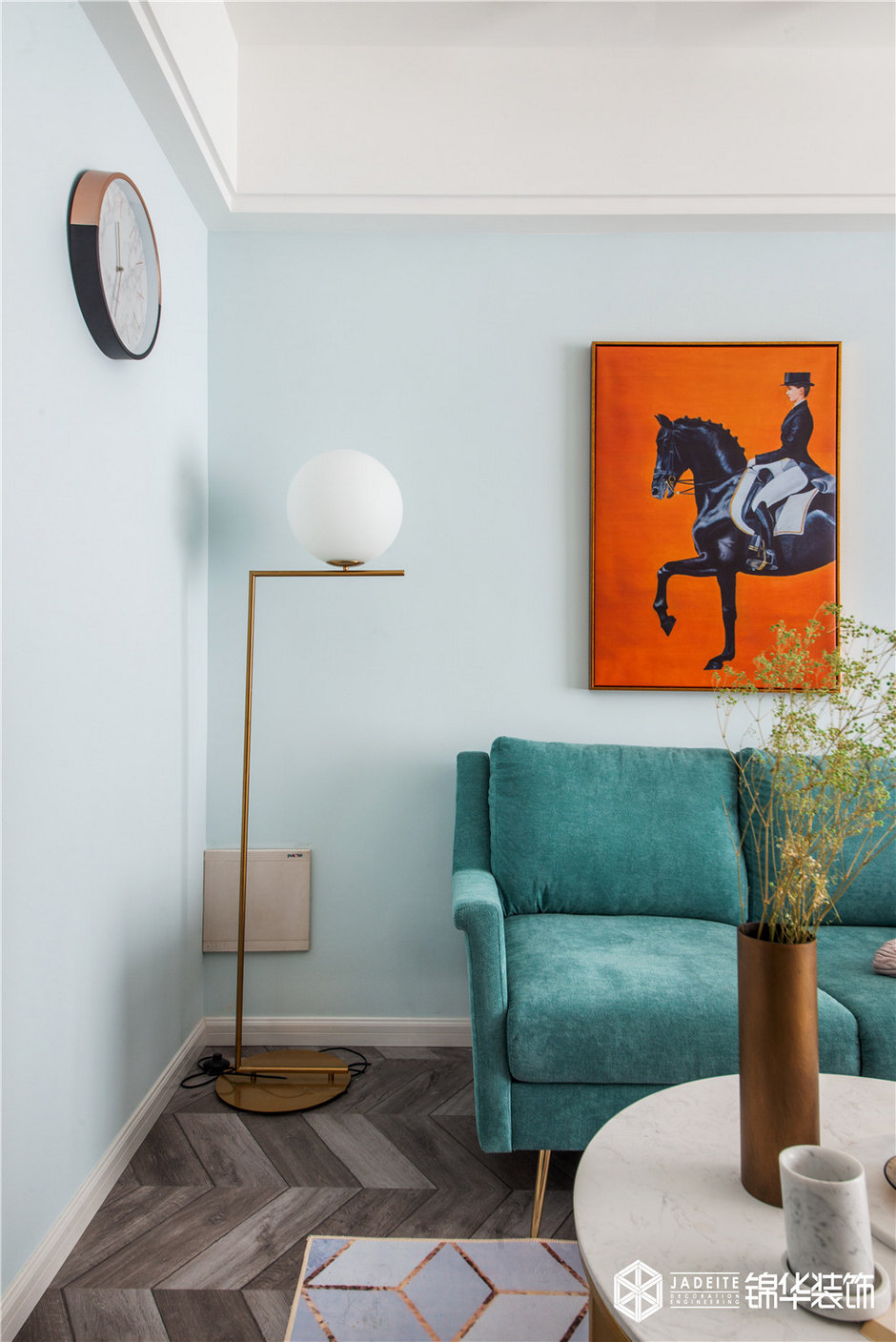 ▲飽和度極高的綠色沙發(fā)和溫暖熱情的紅色裝飾畫,形成大膽的撞色,成為整個空間的亮點!